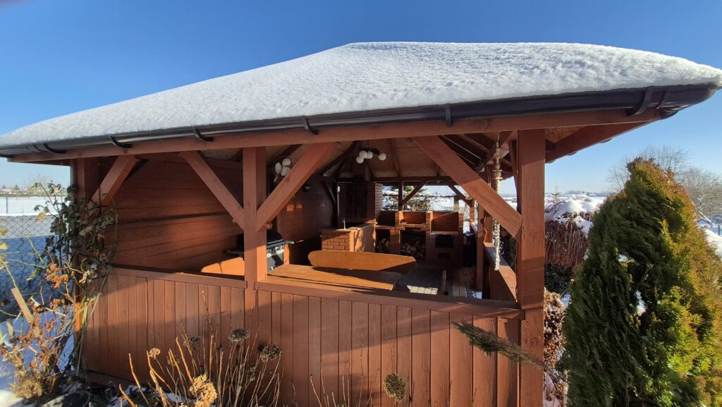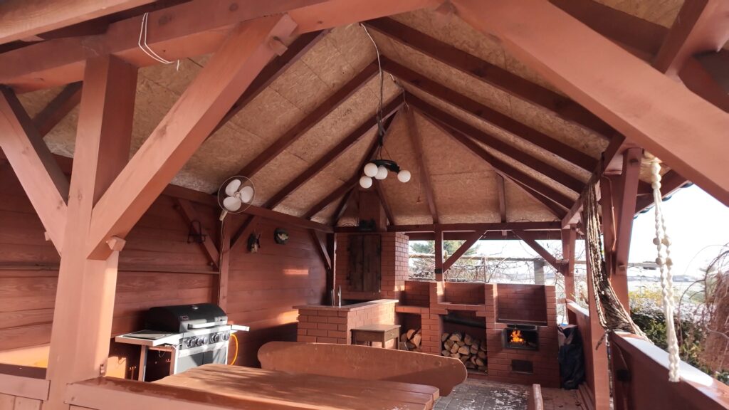 Na działce znajduje się stylowa, duża altana z wędzarnią i mediami, stanowiąca wyjątkową przestrzeń do spotkań rodzinnych i wypoczynku przez cały rok.